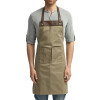 6 oz., 65% polyester, 35% cotton twill; 100% polyurethane trim; Faux leather trim with 2 large eyelets ; Adjustable neckband with press studs; Two bellow-style pockets: 6.5"l x 10"w; 32" L x 28" W;