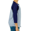 6 oz., 100% USA cotton, 18 singles; Heather Grey is 90% USA cotton/10% polyester; Shoulder-to-shoulder neck tape; 1" double-needle stitched sleeve; Tear away label; Scalloped, merrowed bottom hem; Quarter-turned to eliminate center crease; Contrast raglan sleeves and neck binding;