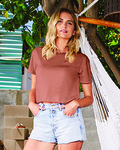 Next Level 3.5 Ounce Womens Festival Cali Crop Top. 65/35% cotton/poly fabric. Raw edge hem and sleeves.