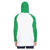 4.5 oz., 60% combed ringspun cotton/40% polyester fine jersey ; fit: adult unisex - true to size; contrast three-piece hood construction; contrast cotton-hand flat braided drawcord; contrast raglan long-sleeve; Easytear™ label; sideseam construction; double-needle hemmed sleeves and bottom; drop tail with side vent construction;