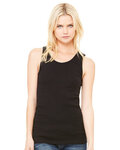 Bella+Canvas Women s 3.7 Ounce Flowy High Neck Tank. Angular, high neck. Back Seam. 65% polyester, 35% viscose. Relaxed drapey fit. Sideseamed. Spaghetti straps. Tear Away Label. 3.7 oz.