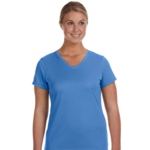 Holloway Ladies Poly Momentum Short Sleeve T-Shirt. Dry Excel 100% polyester interlock smooth knit with color secure technology that helps prevent dye migration. Wicks moisture. Odor resistant. Tagless label. V-neck collar. Garment protects against the sun with 45+ UPF. Set-in sleeves.